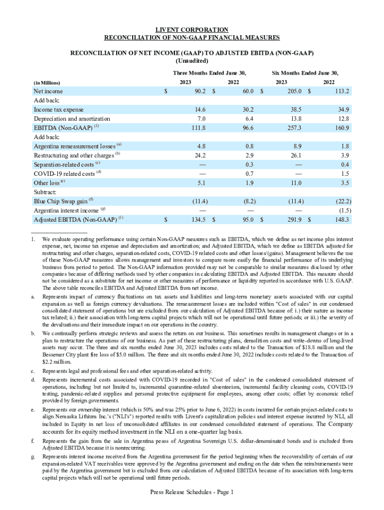 This document provides an unaudited reconciliation of net income (GAAP) to adjusted EBITDA (Non-GAAP) and adjusted after-tax earnings (Non-GAAP) for Livent Corporation for the three and six months ended June 30, 2023. It includes details on special charges, adjustments for restructuring, COVID-19 costs, and other financial metrics, emphasizing the firm\'s financial performance and operational results.