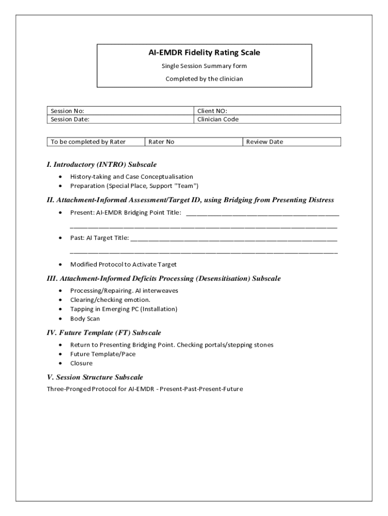 AIEMDR Fidelity Rating Scale Single Session Summary form Completed by the clinicianSession No: Session Date: To be completed by RaterClient NO: Clinician Code Rater NoReview DateI. Introductory (INTRO)