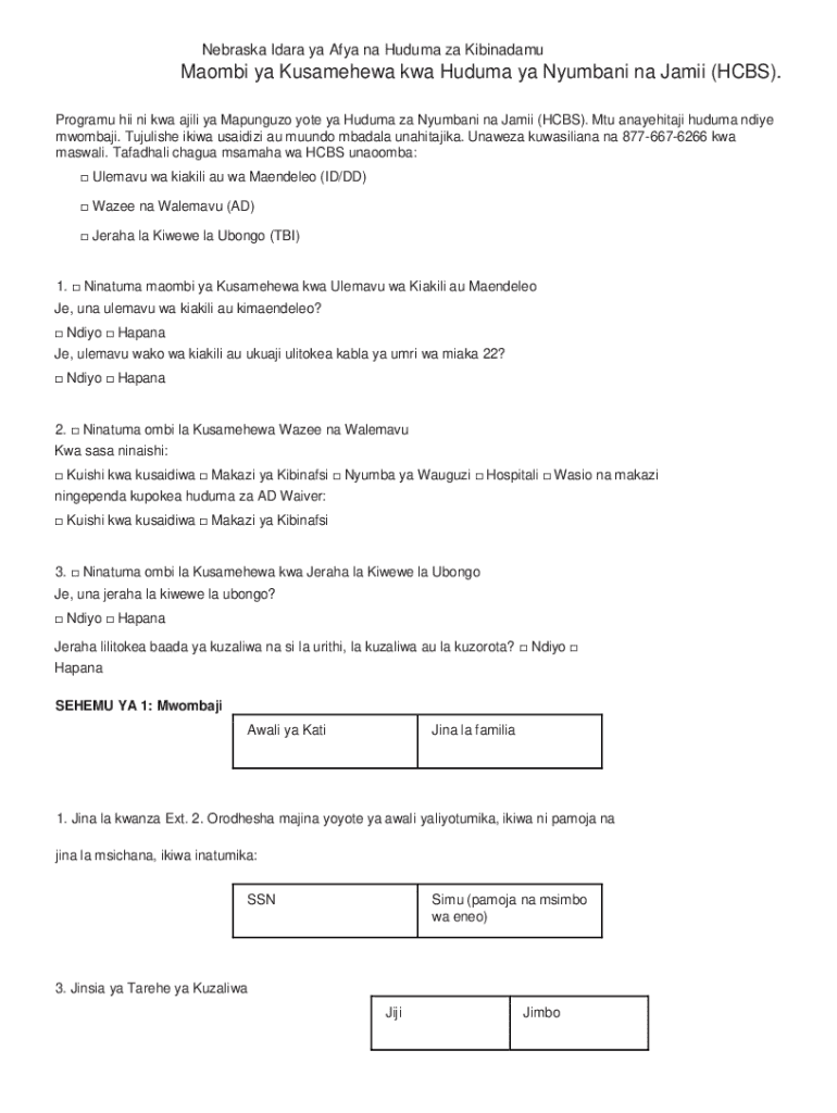 Nebraska Idara ya Afya na Huduma za KibinadamuMaombi ya Kusamehewa kwa Huduma ya Nyumbani na Jamii (HCBS). Programu hii ni kwa ajili ya Mapunguzo yote ya Huduma za Nyumbani na Jamii (HCBS). Mtu anayehitaji
