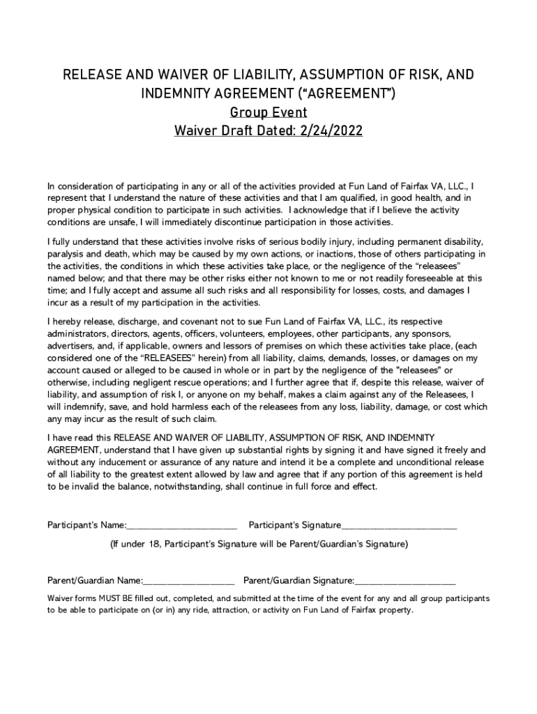 This document is a legal agreement that participants must sign in order to participate in activities at Fun Land of Fairfax VA, LLC. It outlines the inherent risks associated with these activities, the participant\'s agreement to assume all responsibility for any injuries or damages, and the release of liability for the company and its affiliates. It also specifies that if the participant is under 18, a parent or guardian must sign the waiver.