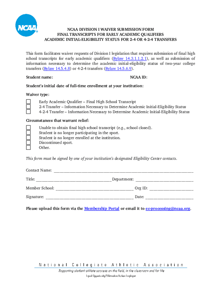 This form facilitates waiver requests of Division I legislation requiring submission of final high school transcripts for early academic qualifiers and information necessary to determine the academic initial-eligibility status of two-year college transfers or 4-2-4 transfers.
