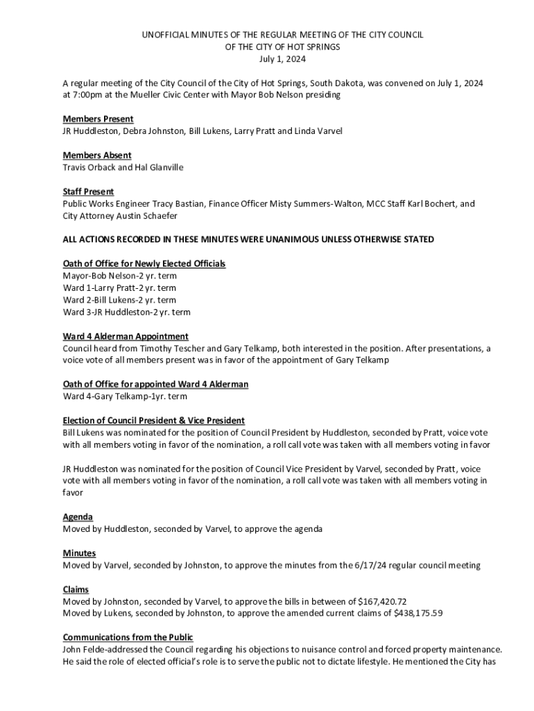 This document contains the unofficial minutes from the regular meeting of the City Council of Hot Springs, South Dakota, held on July 1, 2024. It details the council members present, actions taken, topics discussed, and public relations issues addressed, including updates on city projects, personnel changes, and public comments regarding city ordinances.