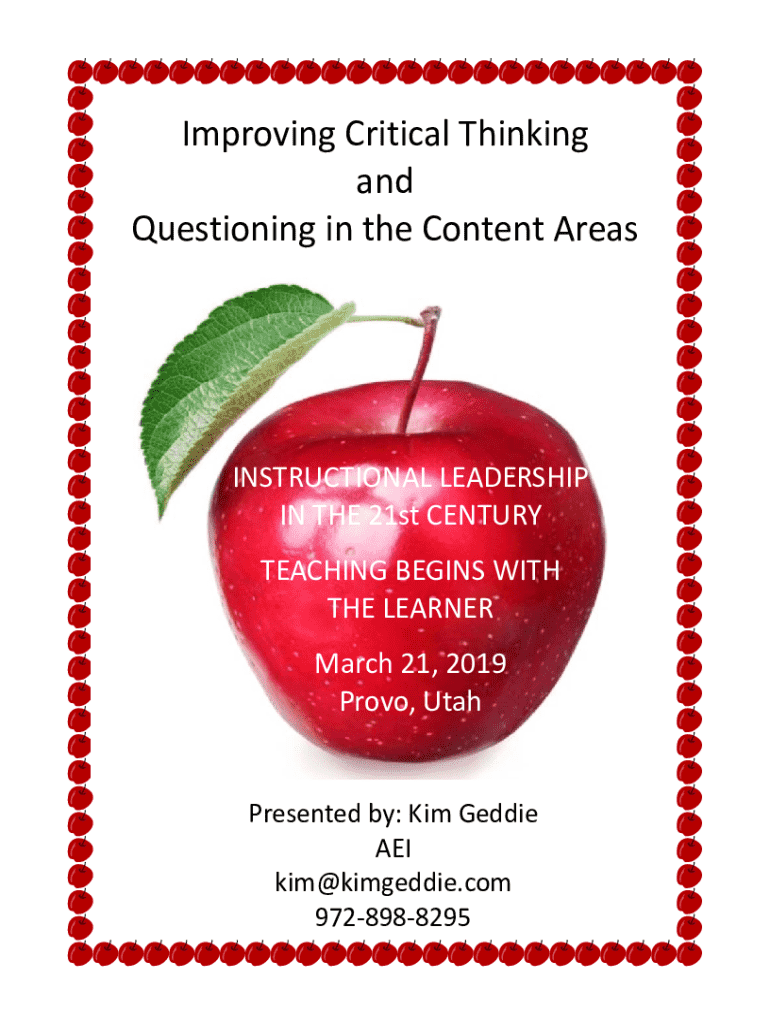 Improving Critical Thinking and Questioning in the Content AreasINSTRUCTIONAL LEADERSHIP IN THE 21st CENTURY TEACHING BEGINS WITH THE LEARNER March 21, 2019 Provo, UtahPresented by: Kim Geddie AEI