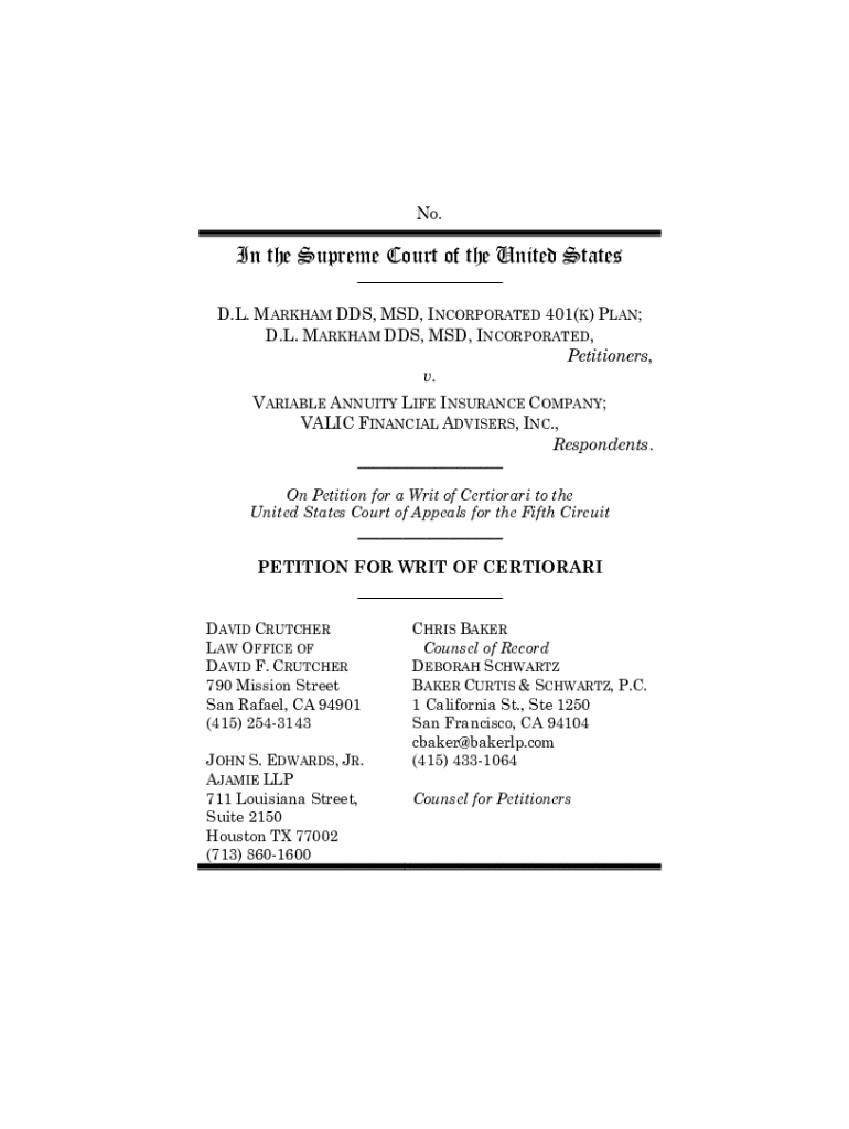 No.In the Supreme Court of the United States ___D.L. MARKHAM DDS, MSD, INCORPORATED 401(K) PLAN; D.L. MARKHAM DDS, MSD, INCORPORATED, Petitioners, v. VARIABLE ANNUITY LIFE INSURANCE COMPANY; VALIC