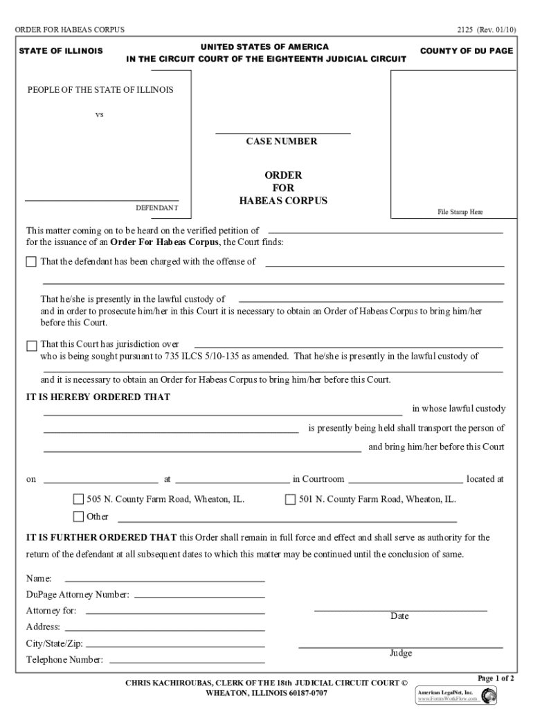 2125 (Rev. 01/10)ORDER FOR HABEAS CORPUS STATE OF ILLINOISUNITED STATES OF AMERICA IN THE CIRCUIT COURT OF THE EIGHTEENTH JUDICIAL CIRCUITCOUNTY OF DU PAGEPEOPLE OF THE STATE OF ILLINOIS vsCASE NUMBERDEFENDANTORDER