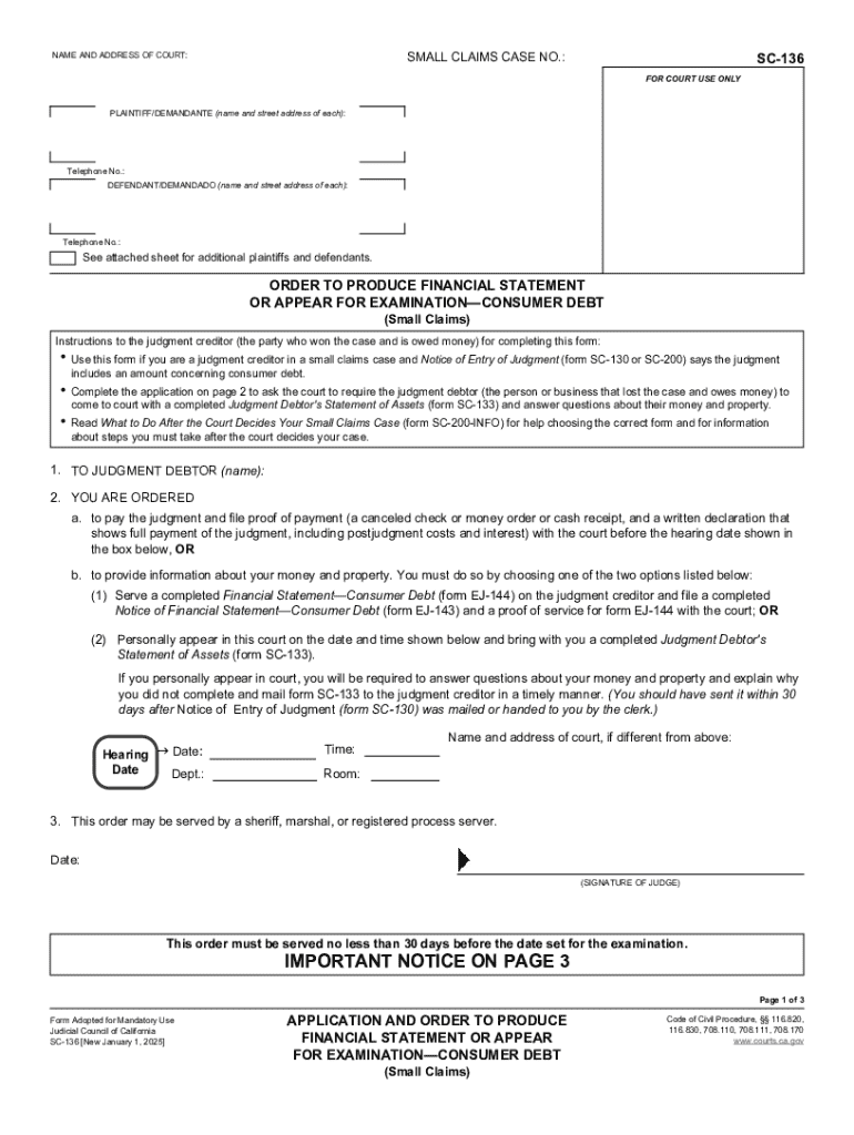 Obtain the SC-136 form from the court's website or at the court clerk's office.