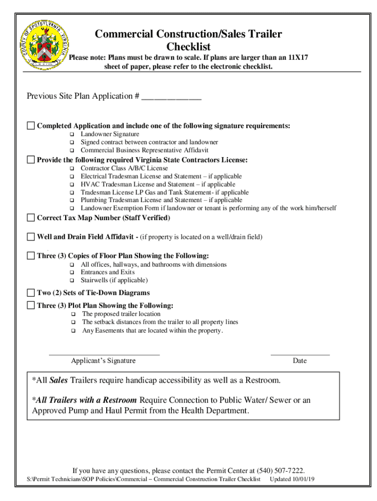 Commercial Construction/Sales Trailer Checklist Please note: Plans must be drawn to scale. If plans are larger than an 11X17 sheet of paper, please refer to the electronic checklist.Previous Site