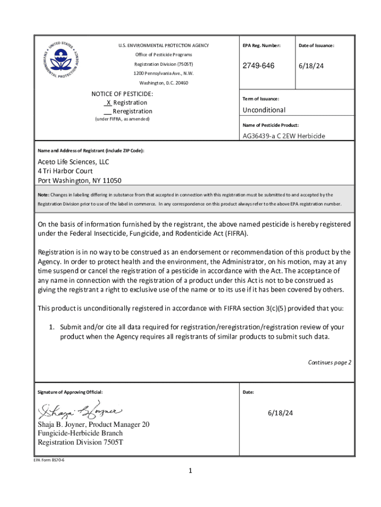 This document details the registration and usage guidelines for AG36439-a C 2EW Herbicide, including target weeds, application methods, rates, safety precautions, and environmental impact. The product is manufactured by Aceto Life Sciences, LLC and registered under the EPA regulations.