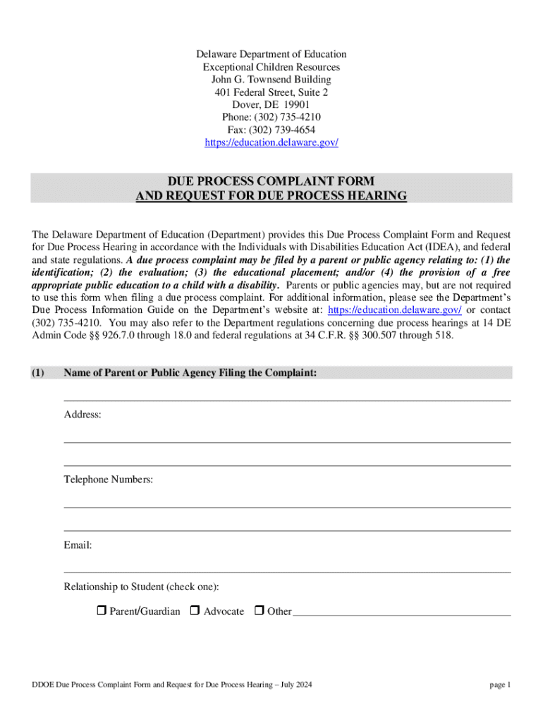 This form is provided by the Delaware Department of Education for parents or public agencies to file complaints regarding the identification, evaluation, educational placement, or provision of free appropriate public education to children with disabilities, in line with the Individuals with Disabilities Education Act (IDEA).