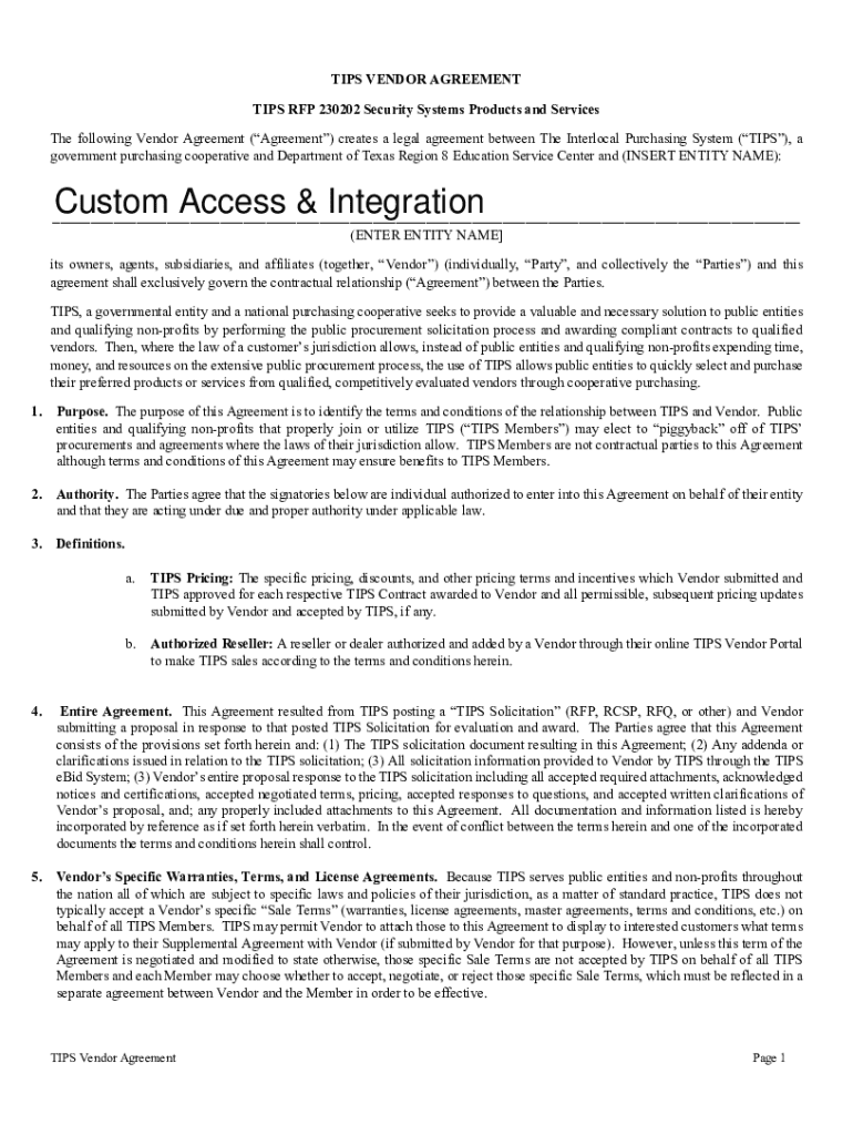 This Vendor Agreement establishes a legal relationship between The Interlocal Purchasing System (TIPS) and the Vendor, outlining the terms for providing security systems products and services to public entities and qualifying non-profits. The agreement allows TIPS Members to procure from approved vendors under terms set forth in the agreement, with provisions for warranties, sales reporting, administration fees, and compliance with various laws and regulations.