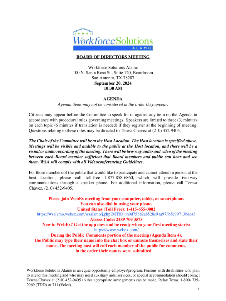 This document outlines the agenda and details for the Workforce Solutions Alamo Board of Directors meeting scheduled for September 20, 2024. It includes the meeting location, time, guidelines for public comments, and key agenda items such as roll call, public comments, consent agenda, committee reports, and the CEO\'s report. It also highlights compliance with videoconferencing guidelines and requirements for participants with disabilities.