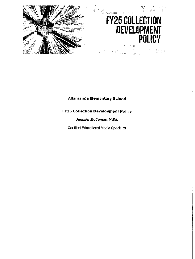 FV25 COLLECTION DEVELOPMENT POLICYAllamanda Elementary School FY25 Collection Development Policy Jennifer Mccomas, M.Ed. Certified Educational Media SpecialistSignature Page Allamanda Elementary School