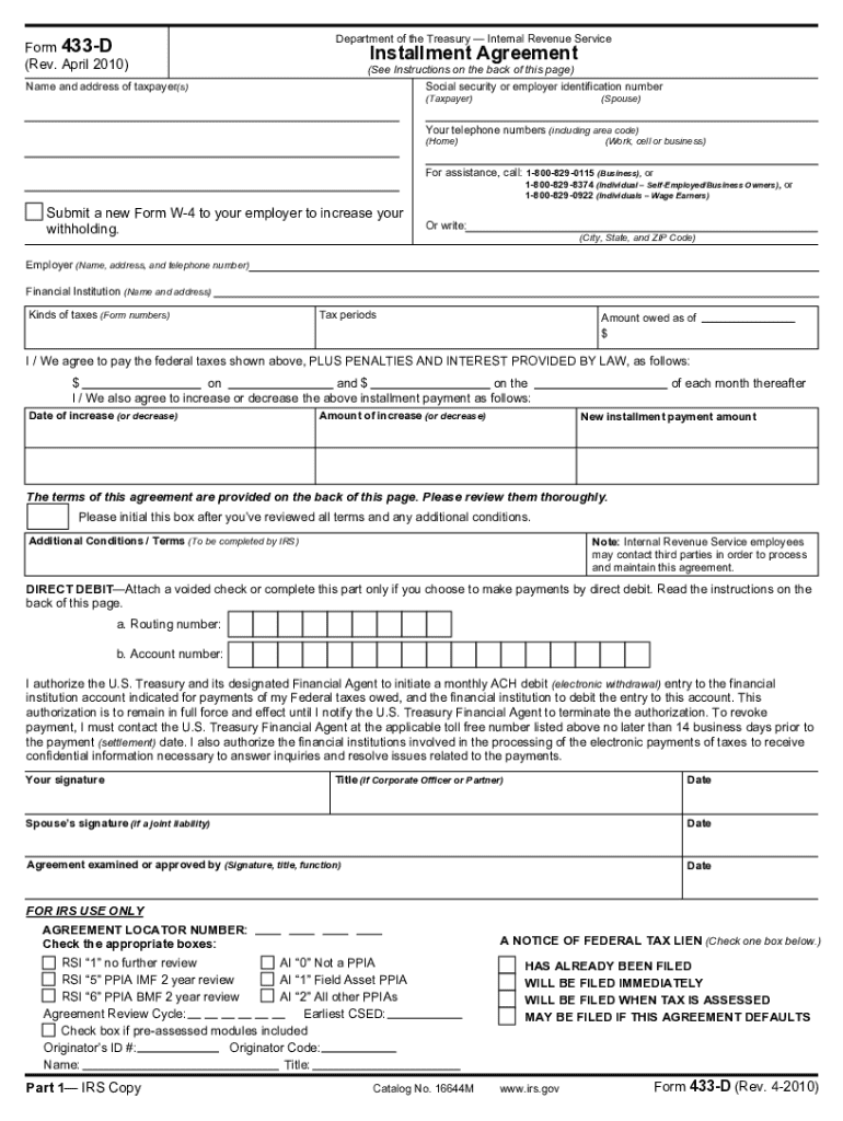 Form 433-D is an Internal Revenue Service document used to establish an installment agreement for taxpayers who owe federal taxes. The form outlines the payment terms, required information from the taxpayer, and procedures for direct debit payments. It is essential for assisting taxpayers in managing their tax liabilities and ensuring compliance with IRS regulations.