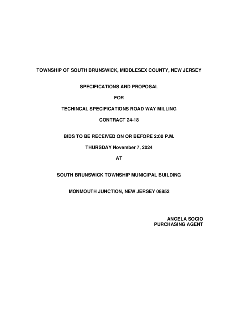 This document outlines the specifications and requirements for sealed bids on the Road Way Milling project in South Brunswick Township. It details the bid submission process, requirements for bidders, contractual obligations, insurance requirements, and scope of work related to the milling of roadways.