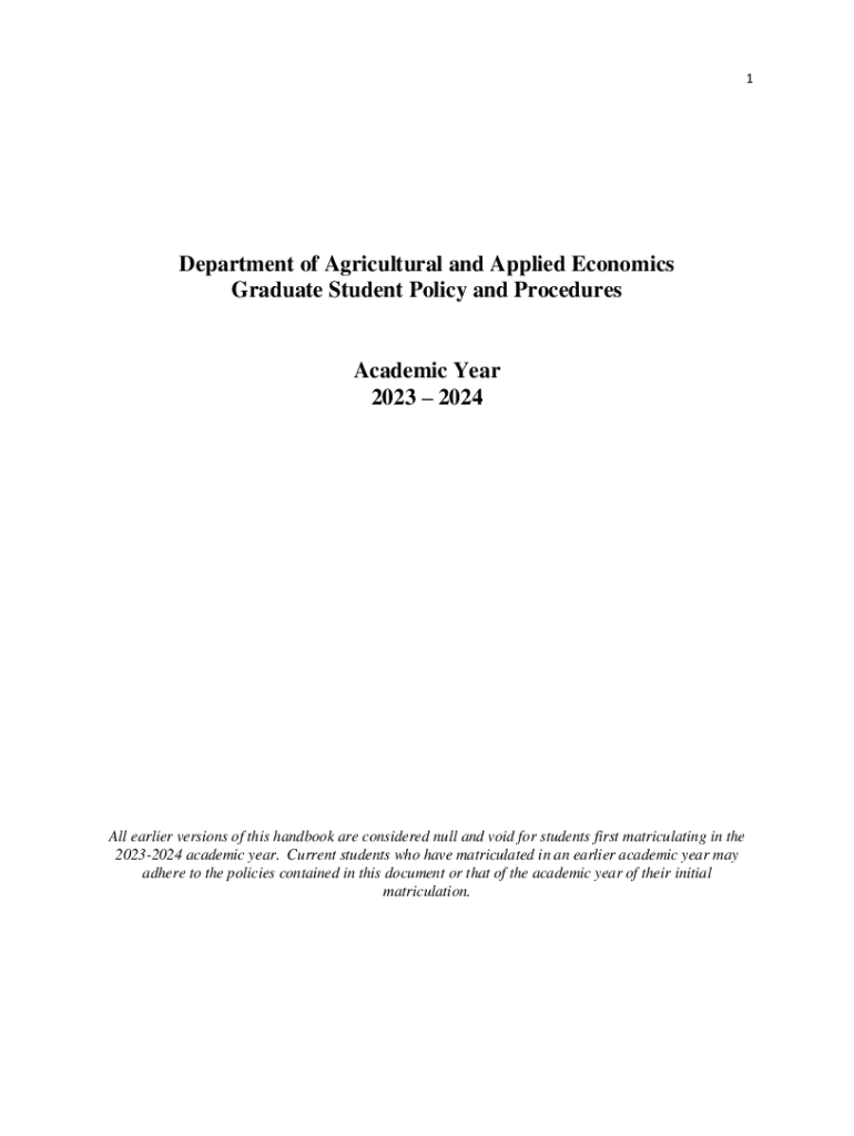 1Department of Agricultural and Applied Economics Graduate Student Policy and ProceduresAcademic Year 2023 2024All earlier versions of this handbook are considered null and void for students first