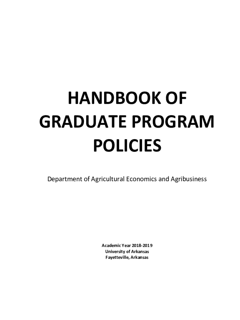 HANDBOOK OF GRADUATE PROGRAM POLICIES Department of Agricultural Economics and AgribusinessAcademic Year 20182019 University of Arkansas Fayetteville, ArkansasHANDBOOK OF GRADUATE PROGRAM POLICIESDepartment