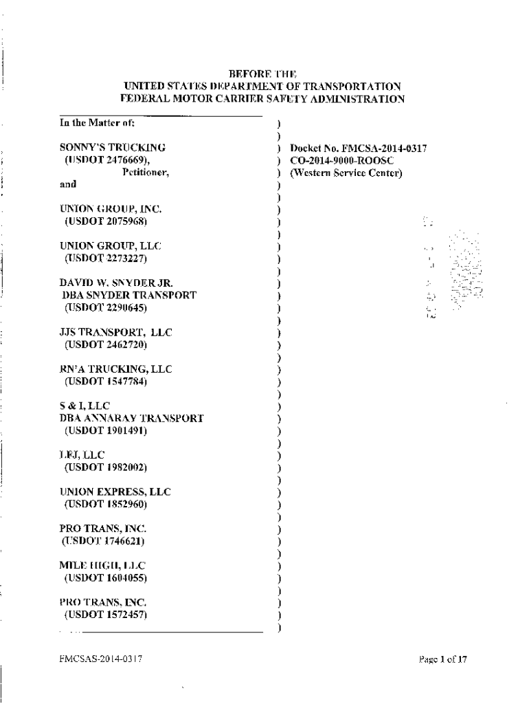 BEFORE THE UNITED STATES DEPARTMENT OF TRANSPORTATION FEDERAL MOTOR CARRIER SAFETY ADMINISTRATION In the Matter of: SONNY\'S TRUCKING (USDOT 2476669), Petitioner, and UNION GROUP, INC. (USDOT 2075968)