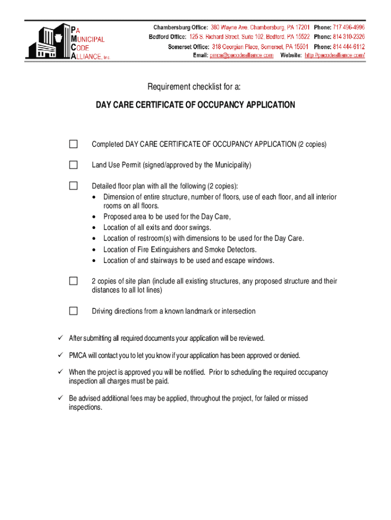 Requirement checklist for a: DAY CARE CERTIFICATE OF OCCUPANCY APPLICATIONCompleted DAY CARE CERTIFICATE OF OCCUPANCY APPLICATION (2 copies) Land Use Permit (signed/approved by the Municipality) Detailed