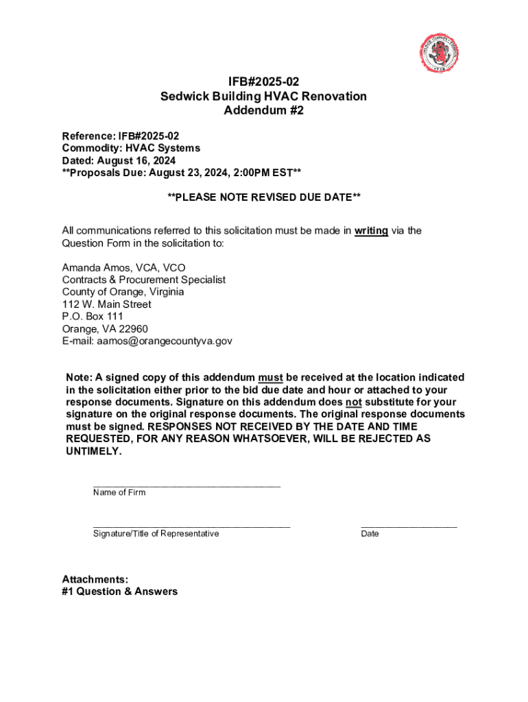 IFB#202502 Sedwick Building HVAC Renovation Addendum #2 Reference: IFB#202502 Commodity: HVAC Systems Dated: August 16, 2024 **Proposals Due: August 23, 2024, 2:00PM EST** **PLEASE NOTE REVISED DUE