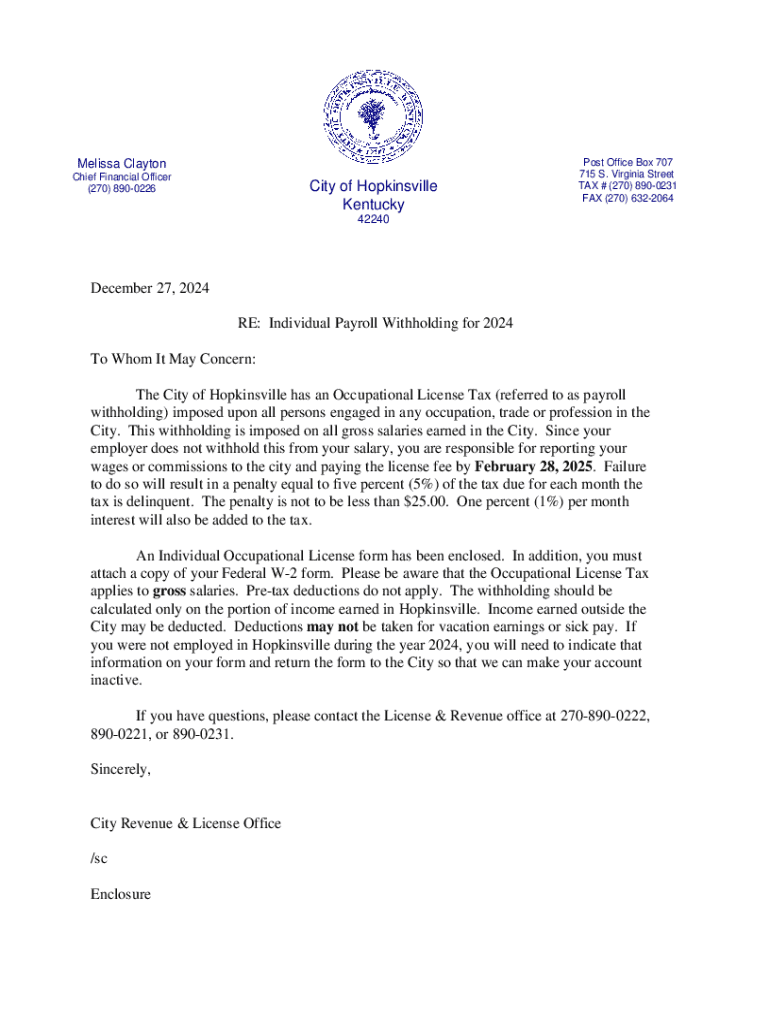 Melissa Clayton Chief Financial Officer (270) 8900226City of Hopkinsville KentuckyPost Office Box 707 715 S. Virginia Street TAX # (270) 8900231 FAX (270) 632206442240December 27, 2024 RE: Individual