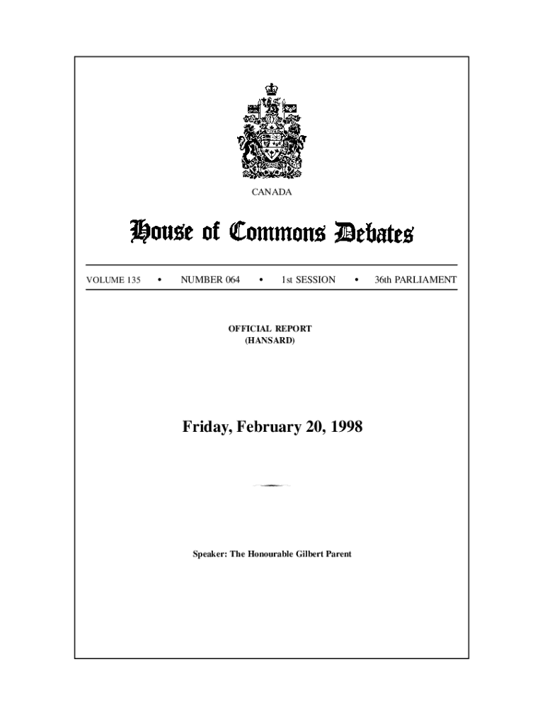 CANADAVOLUME 135SNUMBER 064S1st SESSIONSOFFICIAL REPORT (HANSARD)Friday, February 20, 1998Speaker: The Honourable Gilbert Parent36th PARLIAMENTCONTENTS (Table of Contents appears at back of this issue.)All