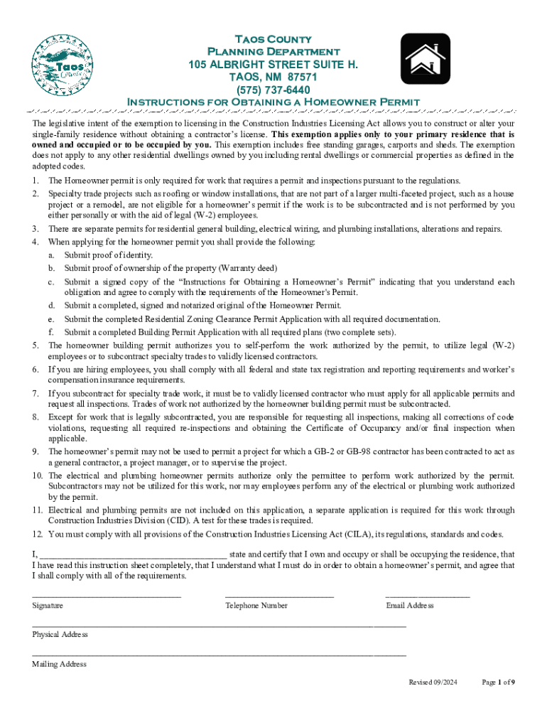 Taos County Planning Department 105 ALBRIGHT STREET SUITE H. TAOS, NM 87571 (575) 7376440 Instructions for Obtaining a Homeowner Permit The legislative intent of the exemption to licensing in the