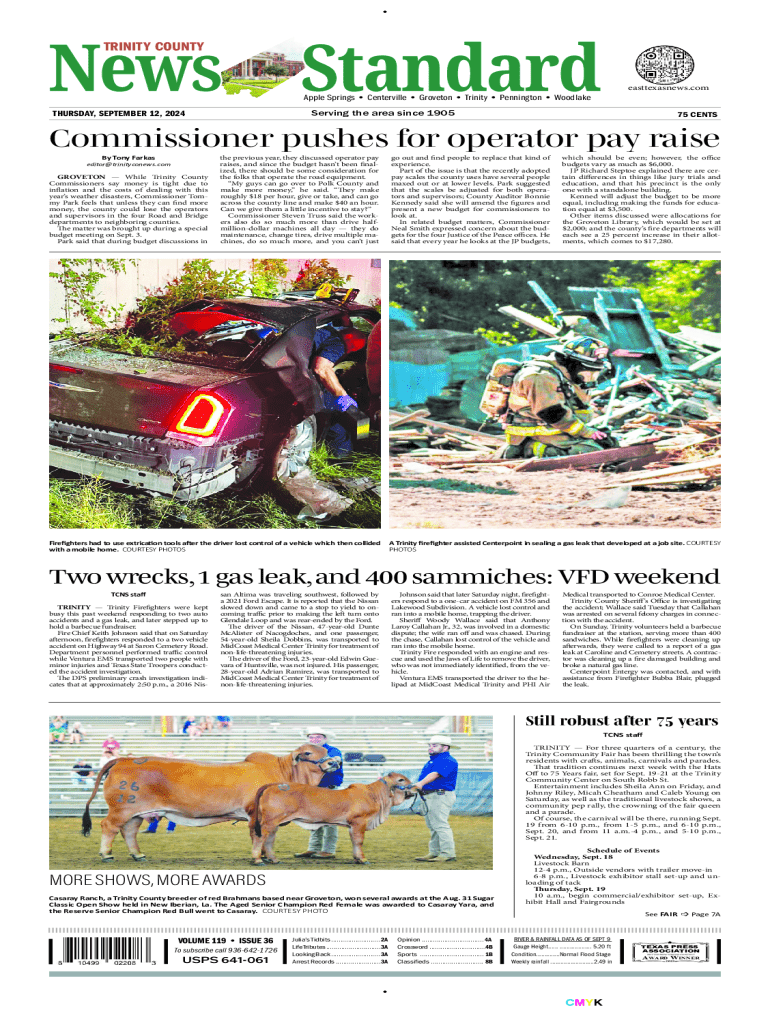 The Trinity County News-Standard provides updates on local governance, community events, and notable incidents within Trinity County, Texas. This edition covers key topics including budget discussions for county salaries, public safety incidents involving local firefighters, preparations and events for the upcoming Trinity Community Fair, and features on local sports performances.