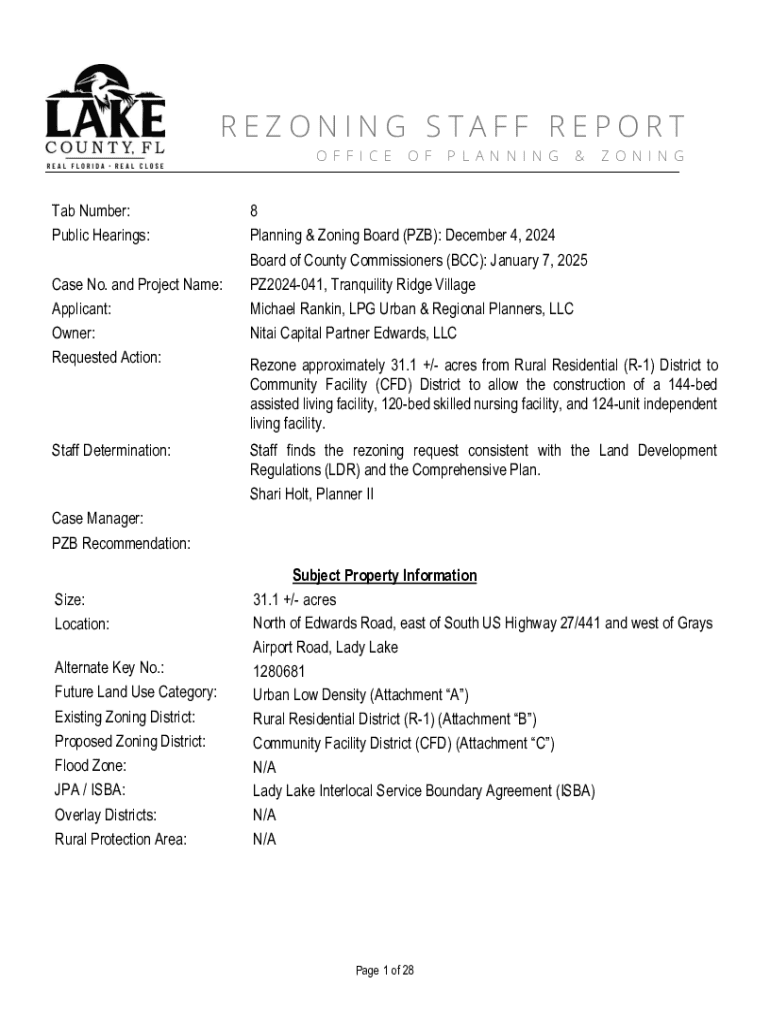 This staff report outlines the rezoning request for approximately 31.1 acres from Rural Residential (R-1) to Community Facility (CFD) to permit the construction of an assisted living facility, skilled nursing facility, and independent living facility. The proposed development complies with the Land Development Regulations and the Comprehensive Plan and aims to provide necessary community support with minimal impact on surrounding areas.