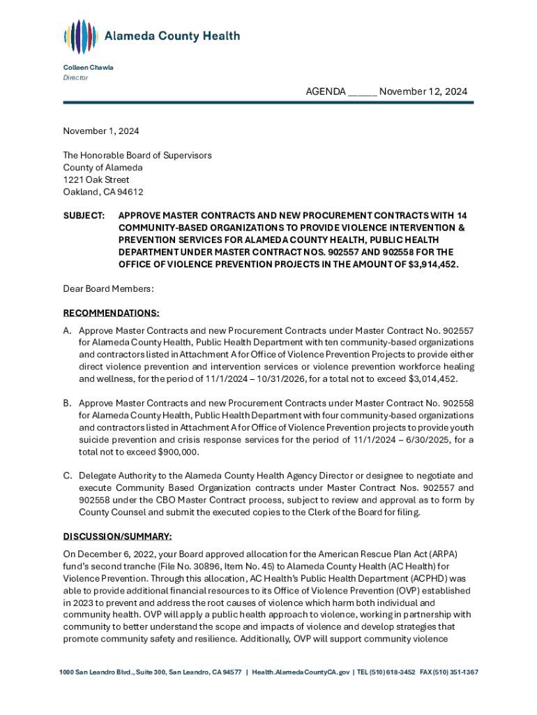 Colleen Chawla DirectorAGENDA ___ November 12, 2024 November 1, 2024 The Honorable Board of Supervisors County of Alameda 1221 Oak Street Oakland, CA 94612 SUBJECT:APPROVE MASTER CONTRACTS AND NEW