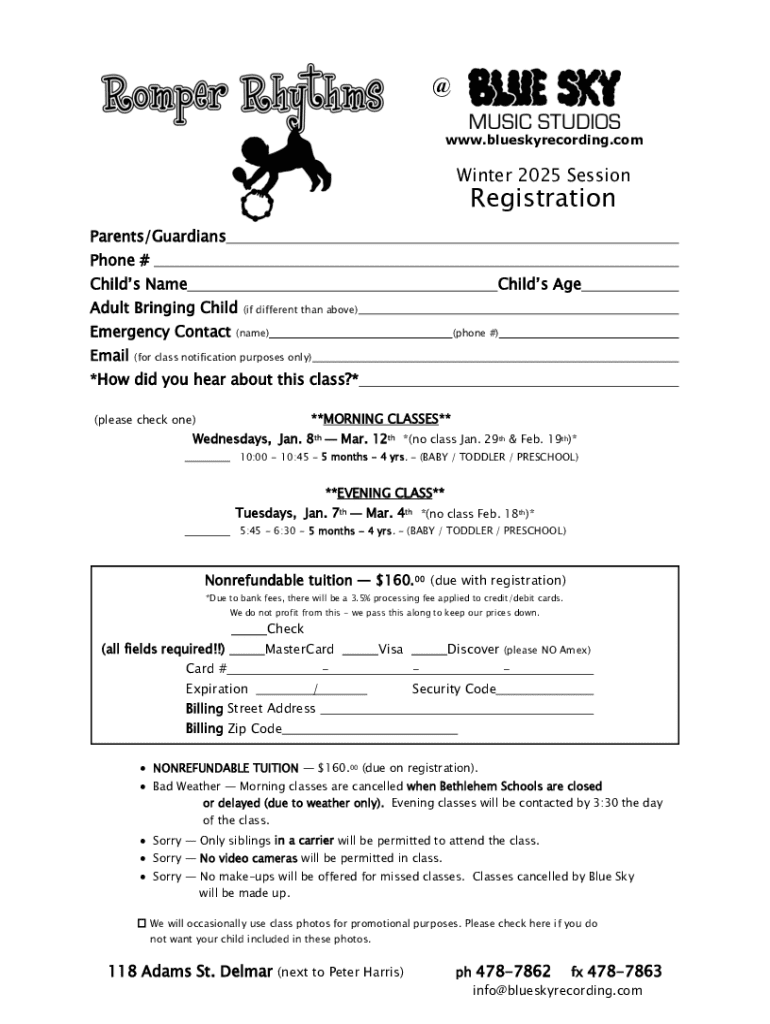 @ www.blueskyrecording.comWinter 2025 SessionRegistrationParents/Guardians Phone # Childs NameChilds AgeAdult Bringing Child Emergency Contact Email(if different than above)(name)(phone #)(for class