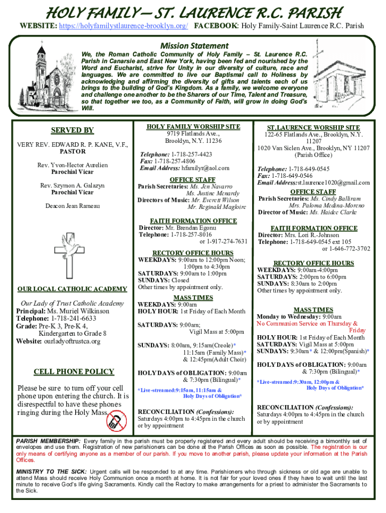 HOLY FAMILY ST. LAURENCE R.C. PARISHWEBSITE: https://holyfamilystlaurencebrooklyn.org/ FACEBOOK: Holy FamilySaint Laurence R.C. ParishMission StatementWe, the Roman Catholic Community of Holy Family