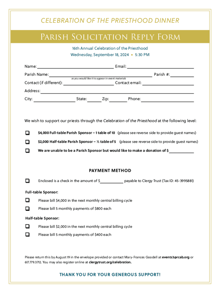 This form is used for parishioners to register for the 16th Annual Celebration of the Priesthood dinner event, allowing them to indicate their support for priests through sponsorship or donations. It includes options for full-table and half-table sponsorships, as well as space to list guest information.