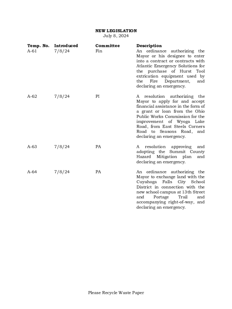 This document outlines various ordinances and resolutions presented by the City Council of Cuyahoga Falls,Ohio on July 8, 2024. It includes authorizations for entering contracts, improvements to public infrastructure, land exchanges, hazard mitigation plans, tax incentives, and emergency declarations necessary for the public welfare.