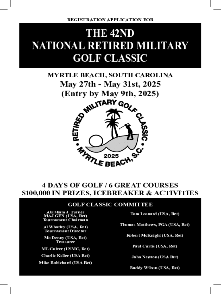assicREGISTRATION APPLICATION FORTHE 42ND NATIONAL RETIRED MILITARY GOLF CLASSICover and which logo isMYRTLE BEACH, SOUTH CAROLINAMay 27th May 31st, 2025 (Entry by May 9th, 2025)ble, renewable, sustainable