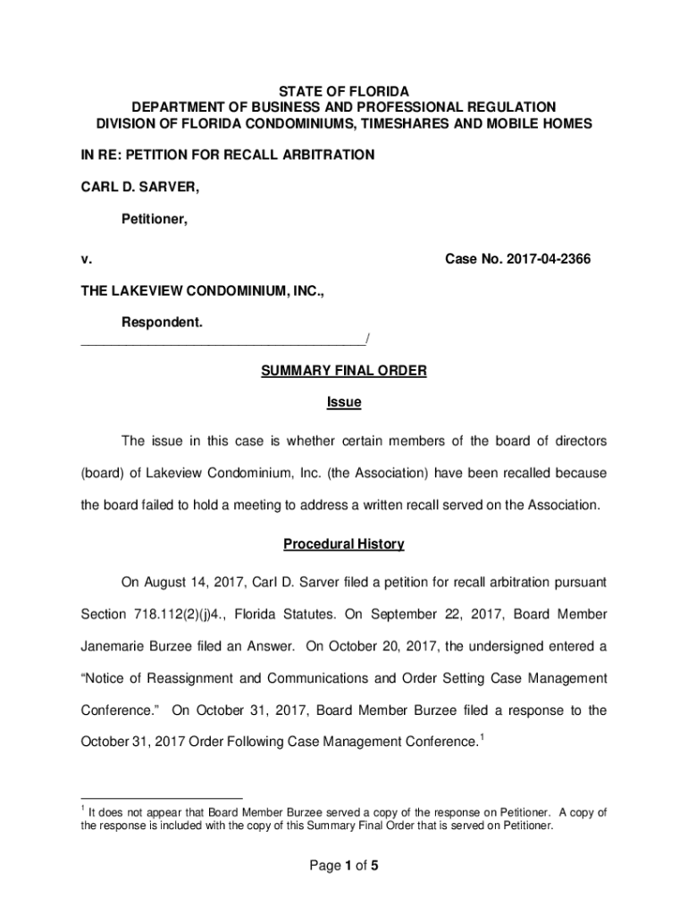 This document details the Summary Final Order regarding a petition for recall arbitration filed by Carl D. Sarver against The Lakeview Condominium, Inc. The case addresses the failure of the condominium board to hold a meeting about a written recall, and it certifies the recall of certain board members.