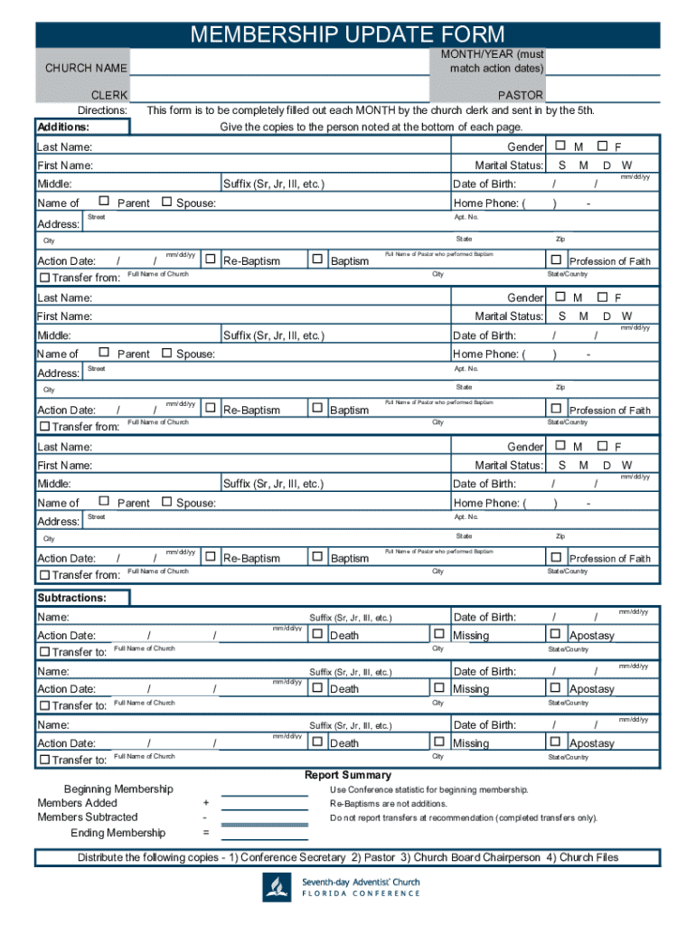 MEMBERSHIP UPDATE FORMMONTH/YEAR (must match action dates)CHURCH NAME CLERK Directions: Additions:PASTOR This form is to be completely filled out each MONTH by the church clerk and sent in by the