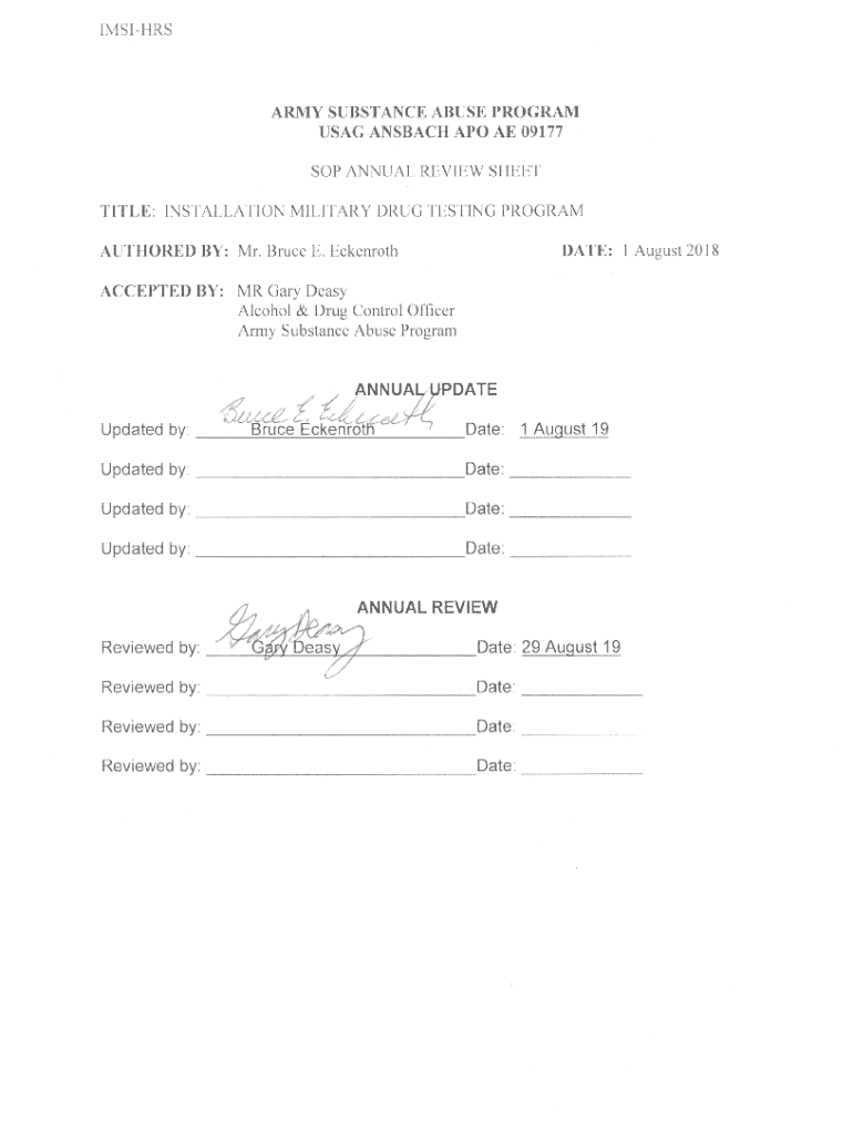 INSTALLATION MILITARY DRUG TESTING PROGRAM ARMY SUBSTANCE ABUSE PROGRAM ANSBACH APO AE 09177 STANDARD OPERATING PROCEDURE FOR INSTALLATION MILITARY DRUG TESTING PROGRAM INDEX 01. Responsibilities.