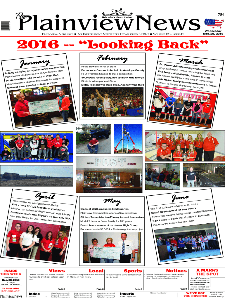 28028 20791 075 Wednesday Dec. 28, 20167PLAINVIEW, NEBRASKA n AN INDEPENDENT NEWSPAPER ESTABLISHED IN 1892 n VOLUME 123, ISSUE 412016 Looking Back Februaryy r a u n a JPirate Bowlers to roll at stateeting
