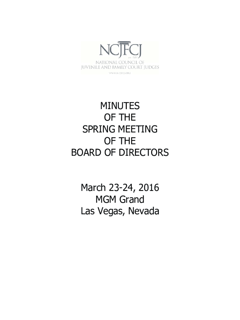 Minutes from the NCJFCJ Board of Directors meeting held on March 23-24, 2016. The document contains details of the meeting\'s agenda, attendance, discussions about board member contributions, important updates on juvenile justice legislation, and various reports from committees related to diversity and governance.