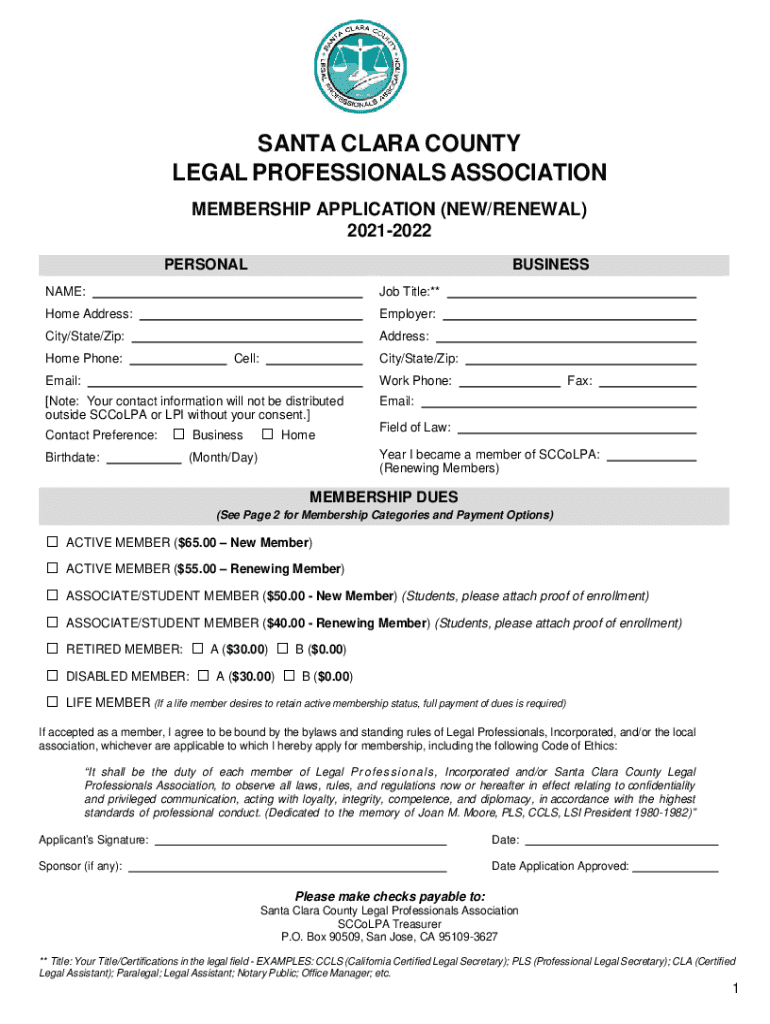 This document is a membership application form for new or renewing members of the Santa Clara County Legal Professionals Association for the years 2021-2022. It includes personal information required for membership, membership dues, categories of membership, and various payment options. It also outlines the responsibilities and ethical obligations associated with membership.