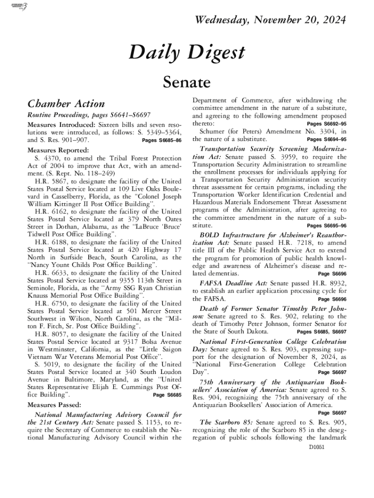 This document contains the proceedings of the Senate including measures introduced, reported, passed, nominations considered, and committee meetings. It highlights significant legislative actions and resolutions from the Senate session on November 20, 2024.