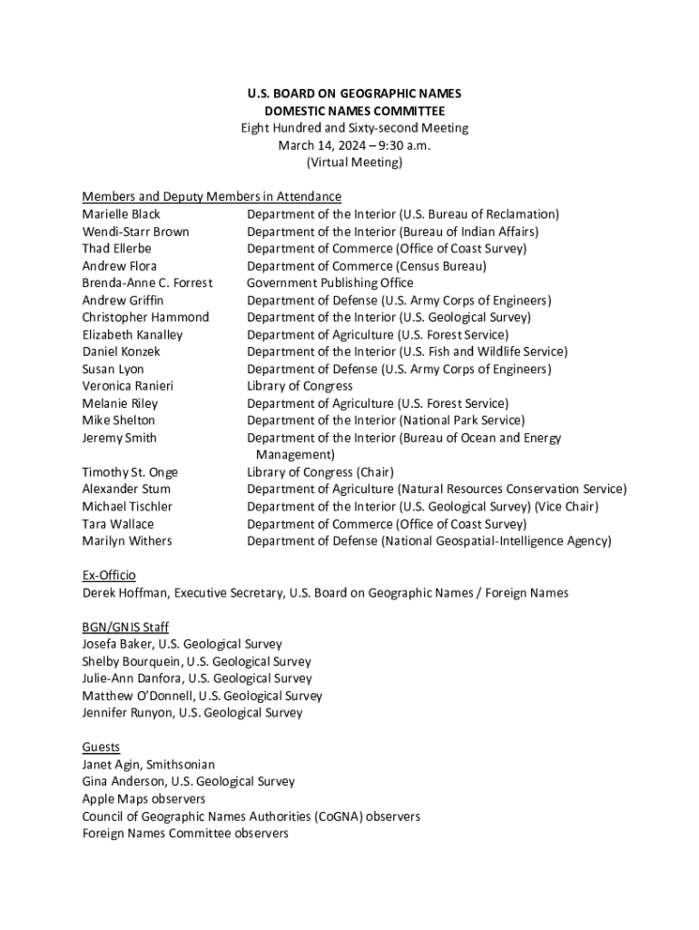 U.S. BOARD ON GEOGRAPHIC NAMES DOMESTIC NAMES COMMITTEE Eight Hundred and Sixtysecond Meeting March 14, 2024 9:30 a.m. (Virtual Meeting) Members and Deputy Members in Attendance Marielle Black Department