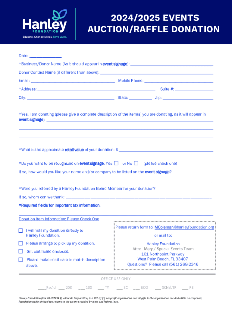 This form is used for making donations to the Hanley Foundation for their upcoming events in 2024 and 2025. It collects essential information about the donor, the donated items, and the preferences for recognition on event signage.