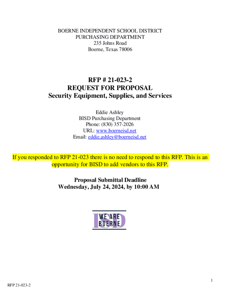 BOERNE INDEPENDENT SCHOOL DISTRICT PURCHASING DEPARTMENT 235 Johns Road Boerne, Texas 78006RFP # 210232 REQUEST FOR PROPOSAL Security Equipment, Supplies, and Services Eddie Ashley BISD Purchasing