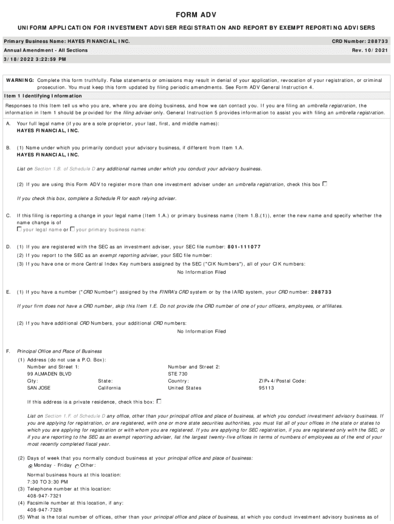 This document serves as an application and report for investment adviser registration and includes pertinent identifying information, business details, and regulatory compliance data for Hayes Financial, Inc.
