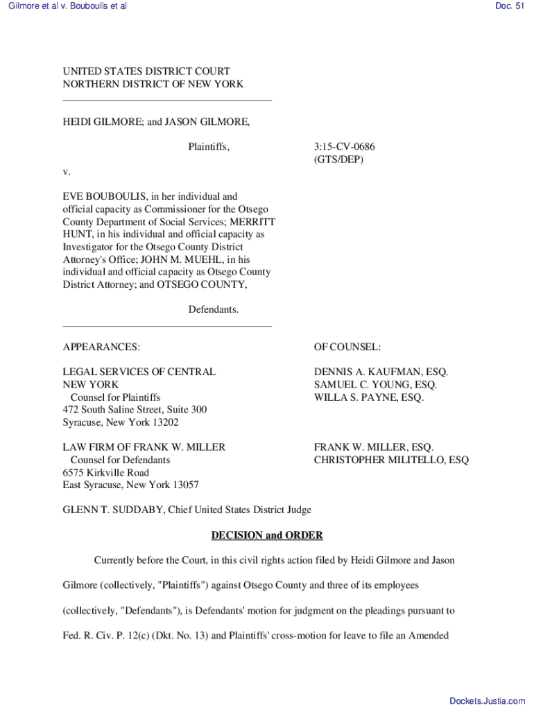 This document contains a decision and order from the United States District Court for the Northern District of New York regarding the civil rights case of Heidi and Jason Gilmore against Otsego County and its employees. It addresses motions for judgment on the pleadings and a cross-motion to file an amended complaint, discussing various legal claims related to alleged violations of procedural due process, SNAP statutes, and other state laws.