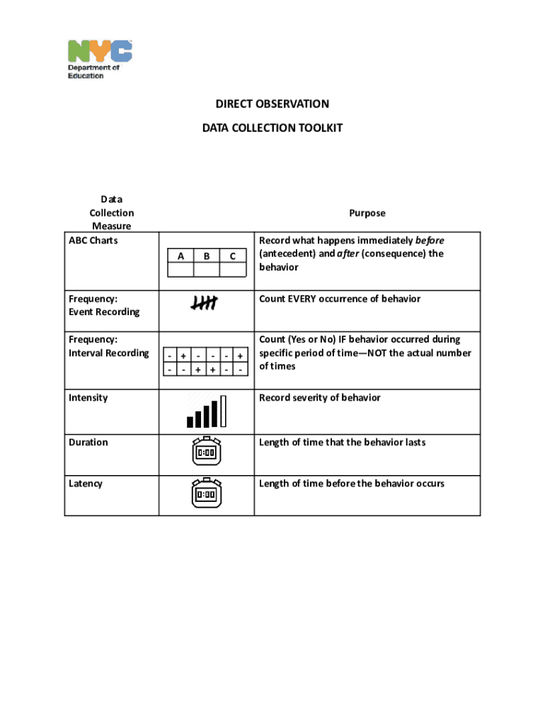 DIRECT OBSERVATION DATA COLLECTION TOOLKITData Collection Measure ABC ChartsPurposeABCRecord what happens immediately before (antecedent) and after (consequence) the behaviorFrequency: Event RecordingCount