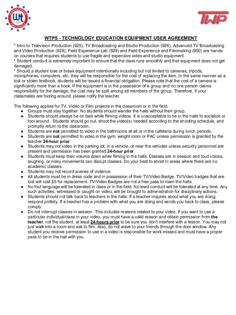 WTPS TECHNOLOGY EDUCATION EQUIPMENT USER AGREEMENT * Intro to Television Production (925), TV Broadcasting and Studio Production (926), Advanced TV Broadcasting and Video Production (928), Field Experience