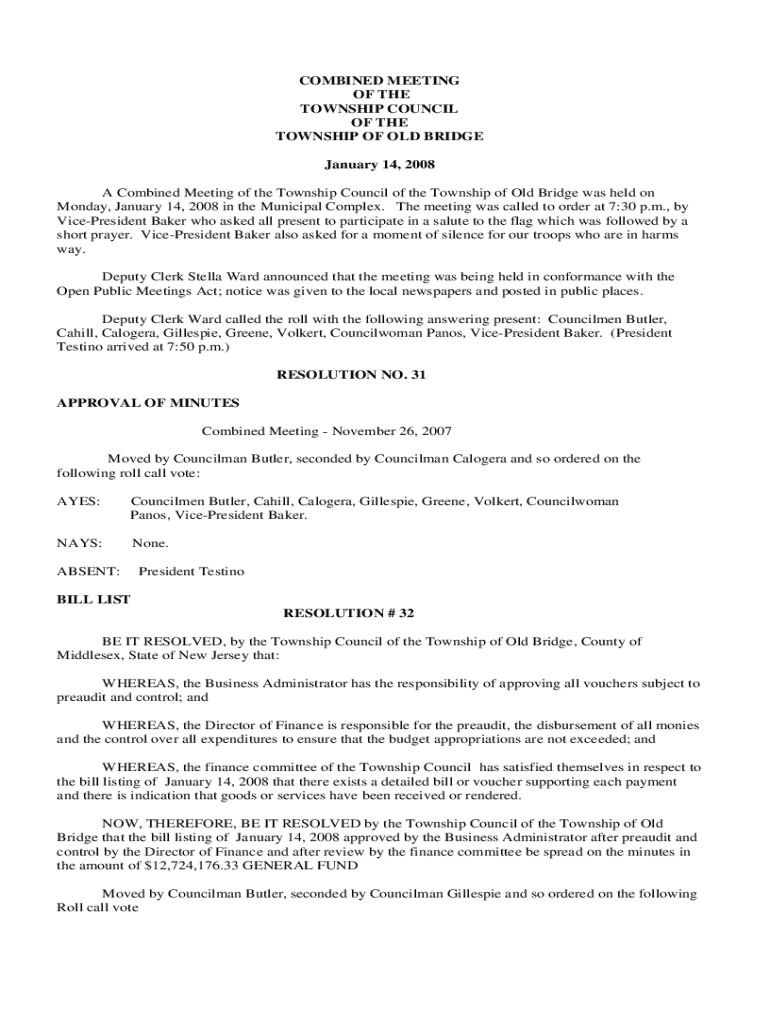 This document is the minutes of the Combined Meeting of the Township Council held on January 14, 2008. It includes roll call, resolutions, public comments, appointments, and various discussions regarding township matters including budgets, ordinances, and professional service contracts.