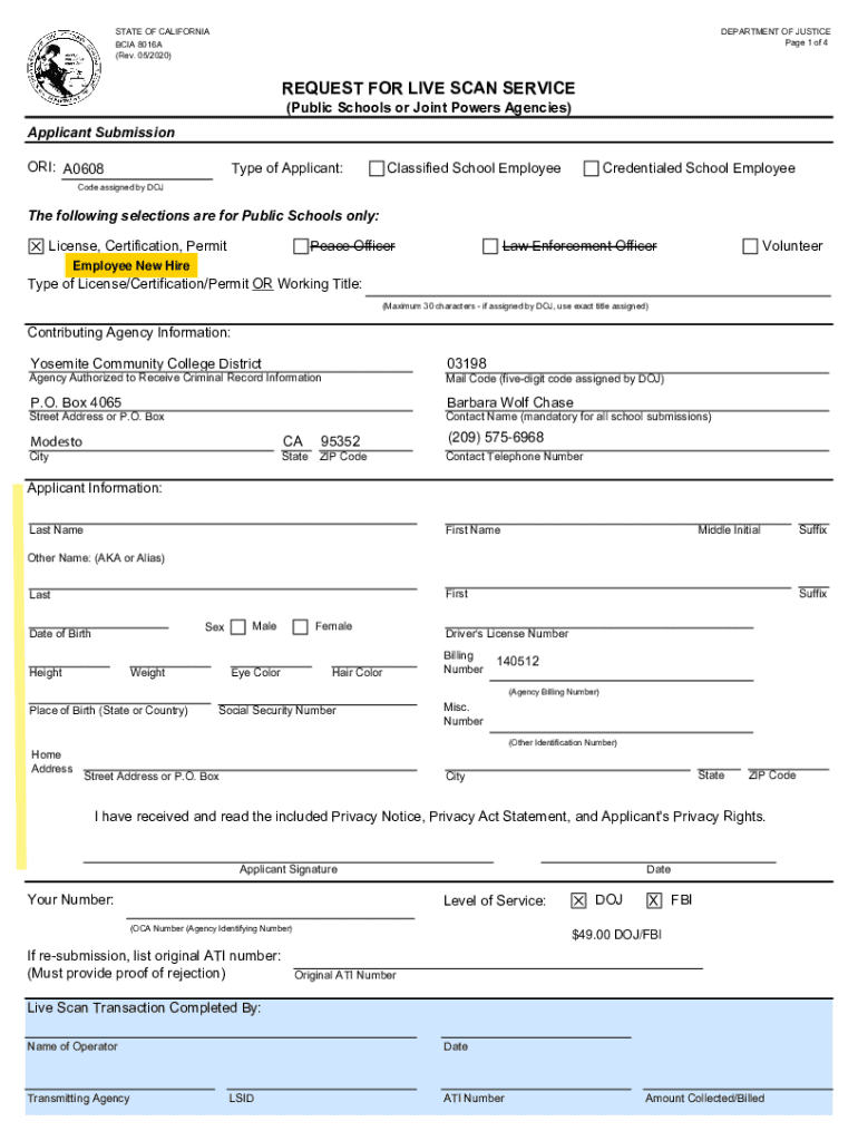 STATE OF CALIFORNIA BCIA 8016A (Rev. 05/2020)Print FormDEPARTMENT OF JUSTICE Page 1 of 4Reset FormREQUEST FOR LIVE SCAN SERVICE (Public Schools or Joint Powers Agencies)Applicant Submission ORI: A0608Type